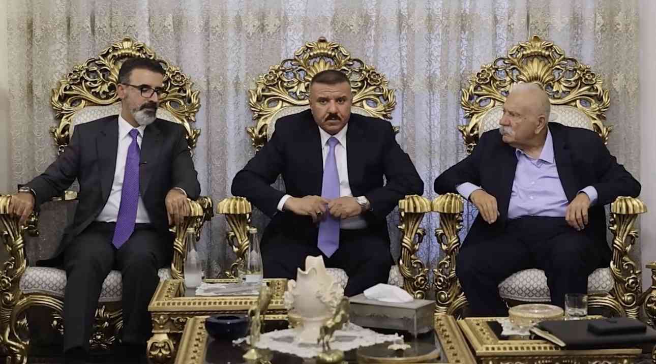 His Excellency the Minister of Interior, Mr. Abdul Amir Al-Shammari, together with the Governor of Kirkuk, Mr. Rebwar Taha, the Deputy Minister of Interior for Police Affairs, Lieutenant General Hadi Razij, and the Chief of Kirkuk Police, visited Sheikh Ibrahim Mustafa Al-Kaki, the Supreme Head of the Kakayi Tribe, in the presence of a number of esteemed tribal leaders.