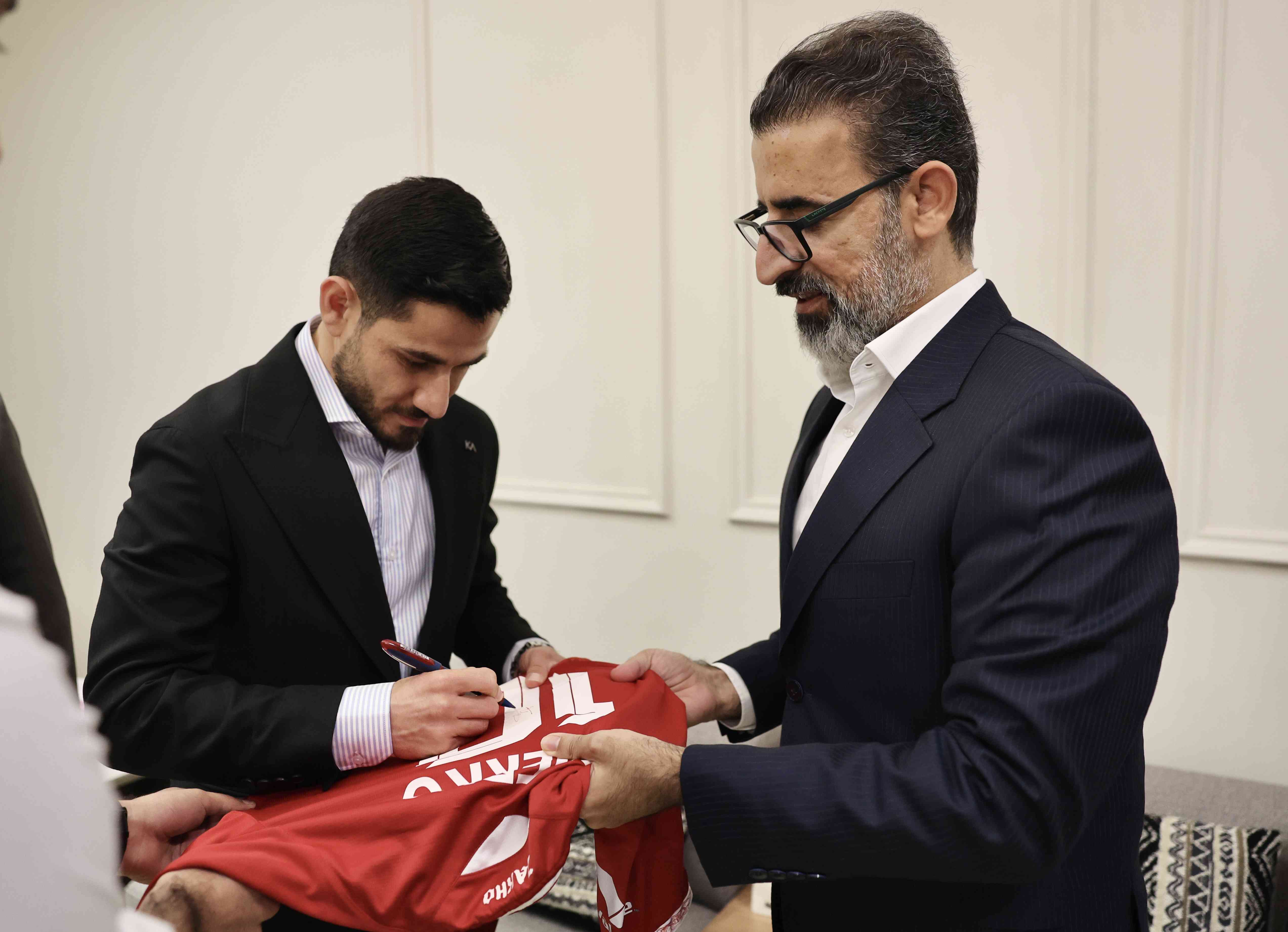 During the meeting, they discussed the sports sector in Iraq in general and in Kirkuk in particular. Sherko Karim also presented a Zakho Club jersey to the Governor.